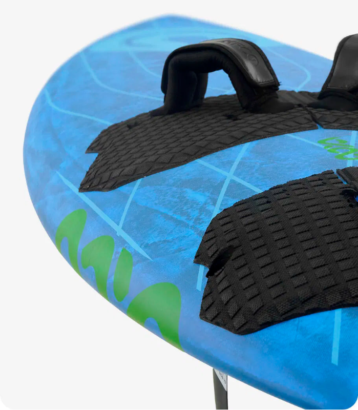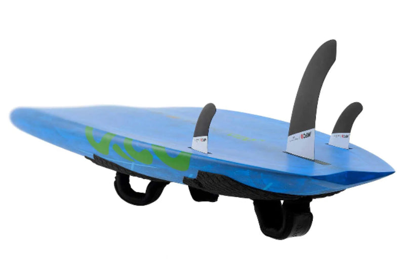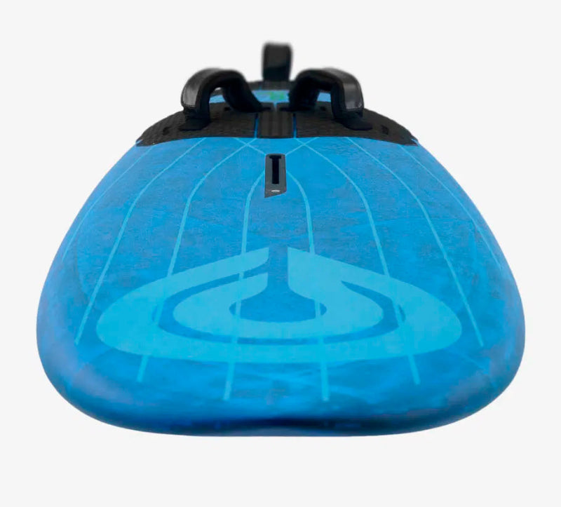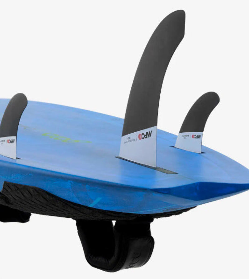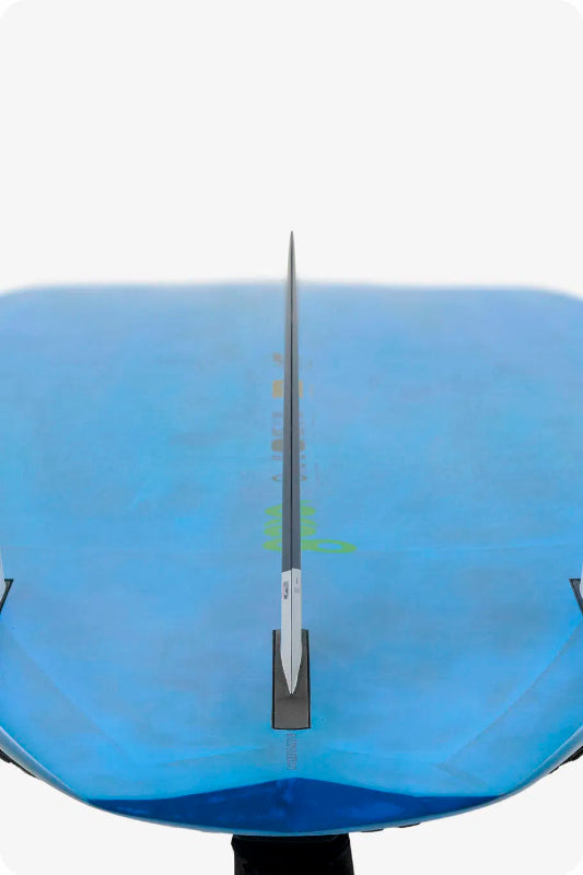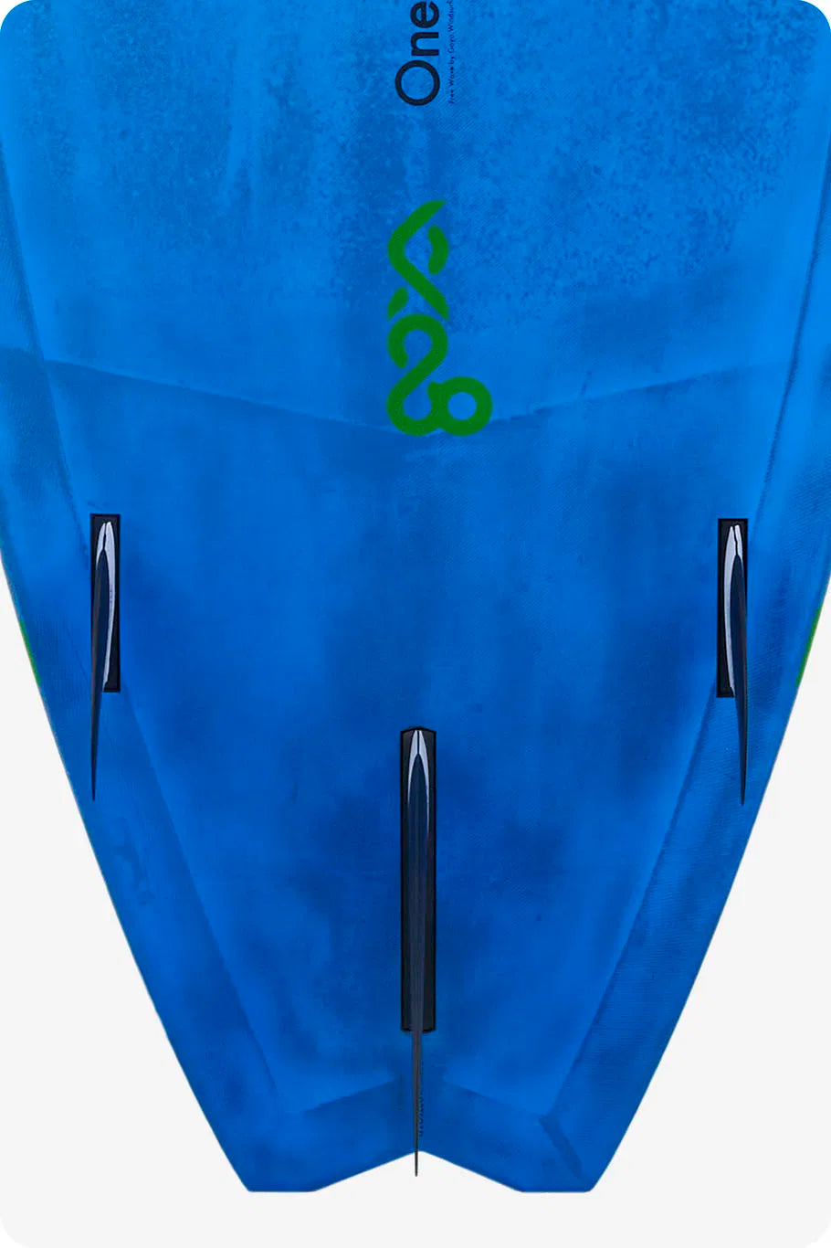 Available in Neon Blue Tech-Reveal GW finish over Car- bon, with Fluo Lime artwork and black pads. A word on fins: The One 12 Carbon is the first of its kind to come with- out compromise on fin position and footstrap position. In previous generations, like on any board with a Powerbox and its inherent screw hole, we had to com- promise on the fin position in relation to the foot strap position. In this traditional format, the center fin would be set too far back. For this new generation, compro- mise was no longer an option for us, and we desired all inserts in the exact and optimal position determined during testing. The solution was to change the design of the fin itself. Together with MFC we have succeeded in positioning the fin forward on its base. Resulting in the perfect fin position and footstrap position. Another step in re-imagining and leaving no stone un- turned in the development and design of our boards.