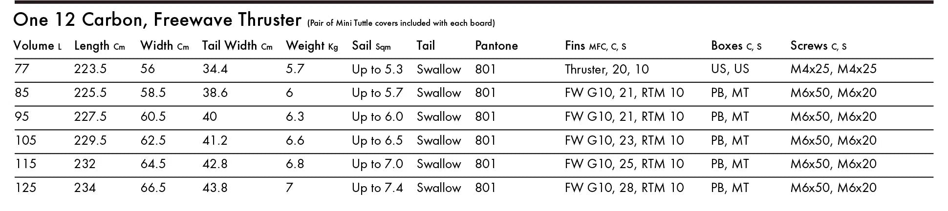 The One 12 Carbon. Generation 12. Combining explosive speed, range, and ultimate comfort. Ridable with the center straps or outboard straps, as a thruster or single fin. The new volume displacement, reduced weight, increased waterflow, and new com- pact outline bring all the power right below the rider. Improving agility and comfort on those longer, choppy runs. Transitioning seamlessly from planing to flying over chop to jibing is second nature to the One, to you and the One. Available in 77, 85, 95, 105, 115, 125 liters. Pro Carbon GW Construction, Carbon & S-Glass Hull technology, Vacuum lamination. Finboxes: 1x Power Box + 2x Mini Tuttle. All new KT Surfing ® Single to Dual Density Traction Pads, sloped, segmented, tactile grooved, ultra light. All new MFC ® fins and footstraps. Inboard and outboard strap position inserts. Hyper Skin GW, High Density Full Sandwich. Carbon Monocoque, connecting masttrack and stance to rails and bottom, forming a cohesive whole.